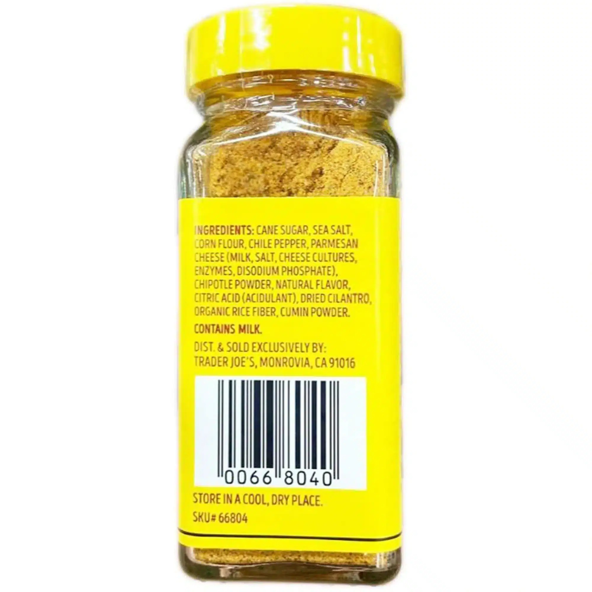CANE SUGAR, SEA SALT, CORN FLOUR, CHILE PEPPER, PARMESAN CHEESE (MILK, SALT, CHEESE CULTURES, ENZYMES, DISODIUM PHOSPHATE), CHIPOTLE POWDER, NATURAL FLAVOR, CITRIC ACID (ACIDULANT), DRIED CILANTRO, ORGANIC RICE FIBER, CUMIN POWDER.